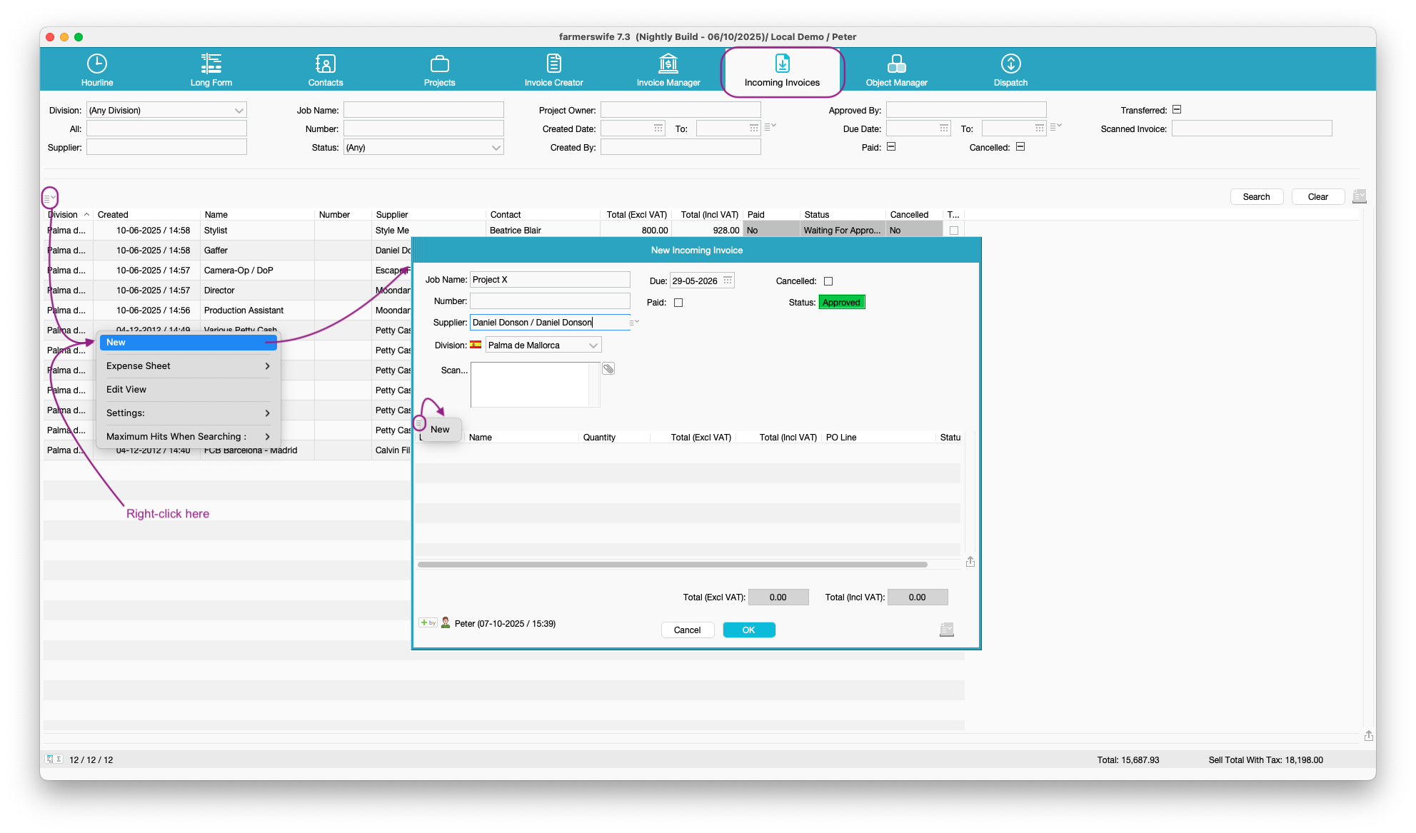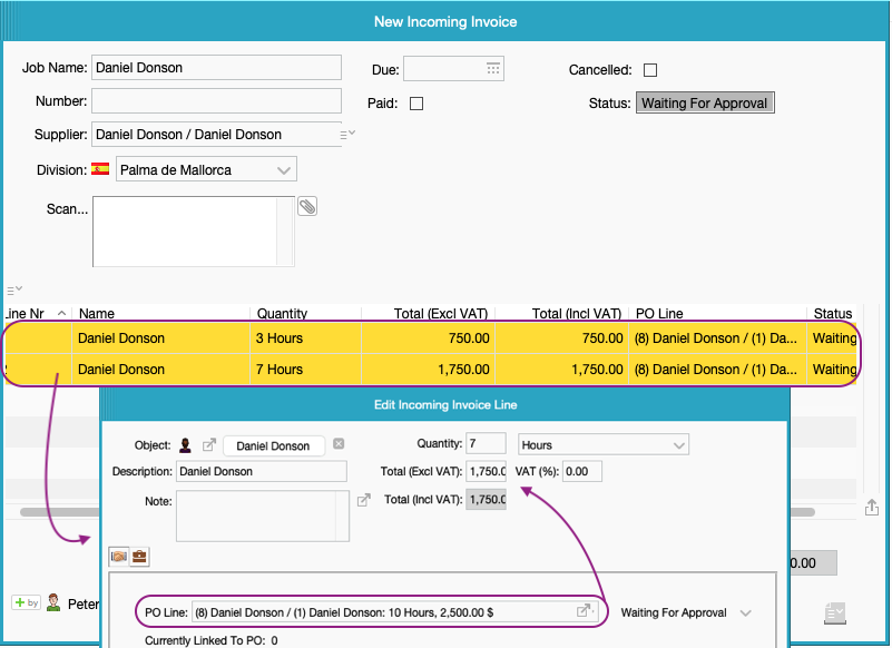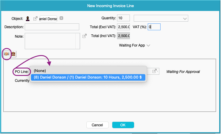 However, there is also a simpler workflow that bypasses the whole use of POs and links Incoming Invoice lines directly to Projects (through the corresponding Quantity, Unit and Rates). Each line can be split onto multiple Projects with different Quantities and Totals. Each link can be individually approved/rejected by the respective Project Owner (i.e. the User who created the Project).