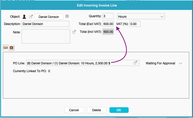 If the amount in the Incoming Invoice Line does not match the Actuals linked to the original PO, a pop-up dialog will warn: 'Warning: The Actuals Linked To The PO Amount To: 2,000 (10 Hours). This II Line Amounts To: 2,400'.