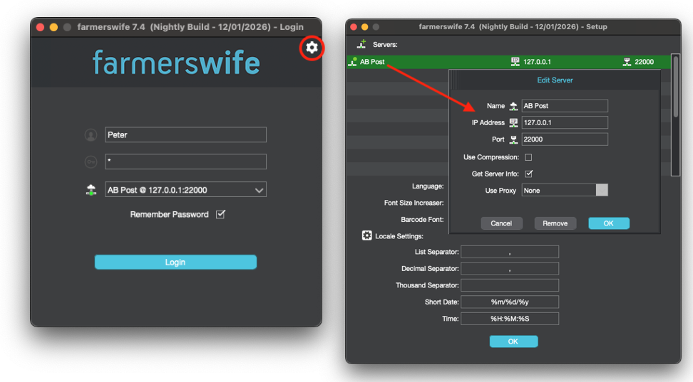 To use the farmerswife system, your Desktop Client must be connected to your Server so it can communicate with your database and allow users to work effectively. The setup differs slightly depending on whether your Server is self-hosted or cloud-hosted.