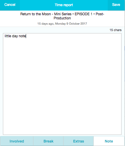 Add Involved (depends on User Permission Profile), Breaks, Extras and Notes. Once done, press SAVE to save your changes and get the Time-Report to appear under "Recent".
