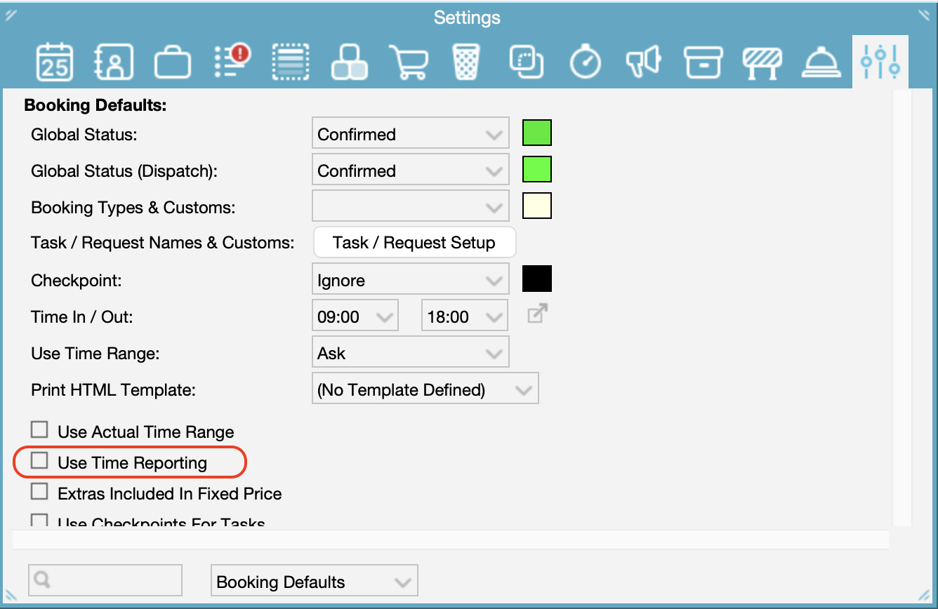 Toolbox > Settings > Booking Defaults > Use Time Reporting