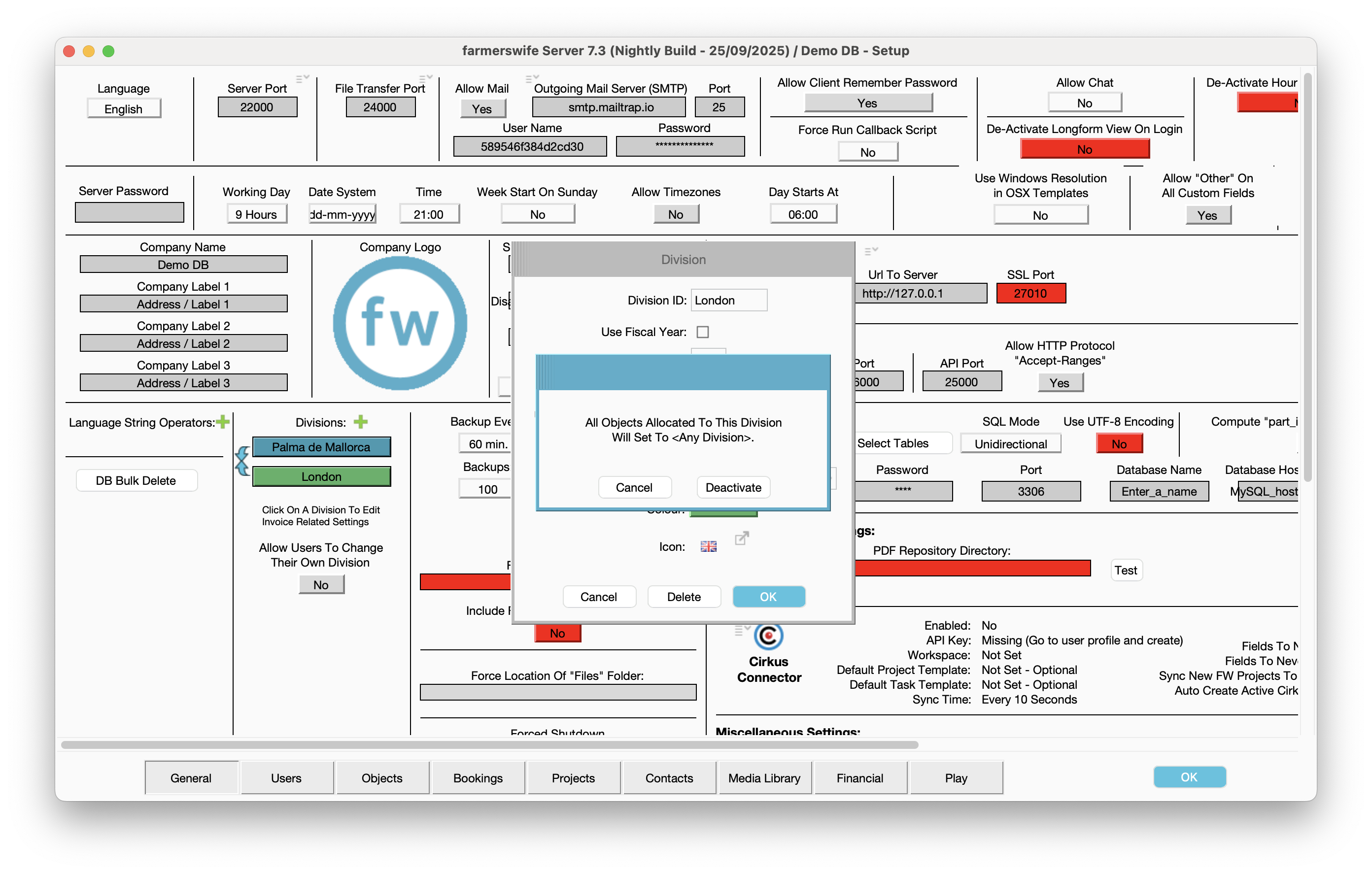 - All Object and Clients allocated on a different Division than on the main one will be reallocated to the main Division (Which is the first one in list placed on server setup > General Tab).