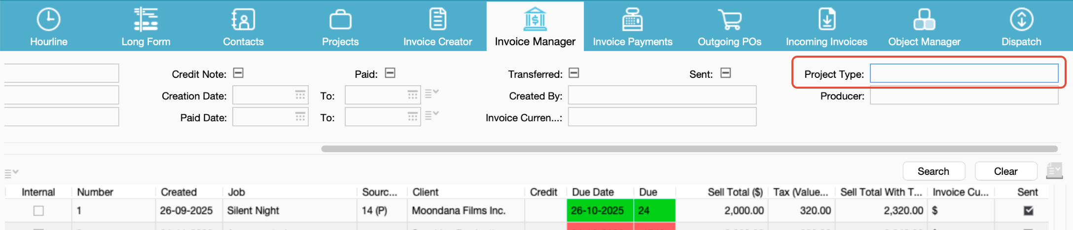 See below example where the Invoice Custom was created as Entry field so there's no dropdown in the Invoice Manager to filter by the values.