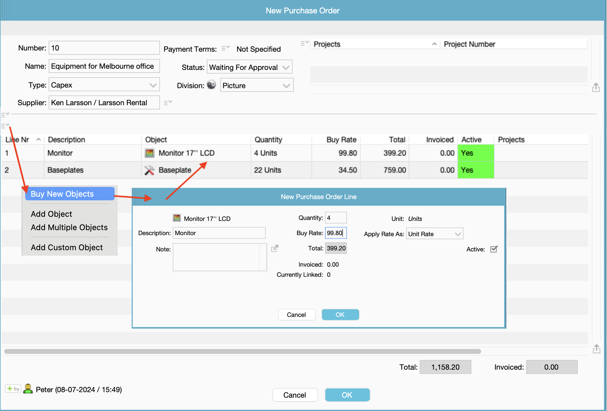 Open a new Purchase Order, and after having filled in the necessary data, select the option in the drop down menu: "Buy New Objects". A list of all Object Classes will appear, so choose one Object Class at a time.