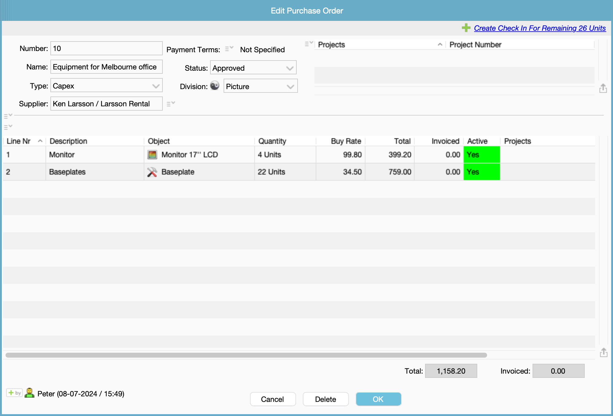 If you are the one creating the PO and also allowed to approve POs yourself, you can choose to approve the PO right away which will prompt the message: "Would You Like To Create The CheckIn For This PO's Objects Now?" and thus create the PO Checkin for you. Or you can choose to approve it later and you will be prompted with the message at that stage. You can always choose to click on Create Check In For Remaining xx Units, to create the Purchase Order Check In (PO Checkin).