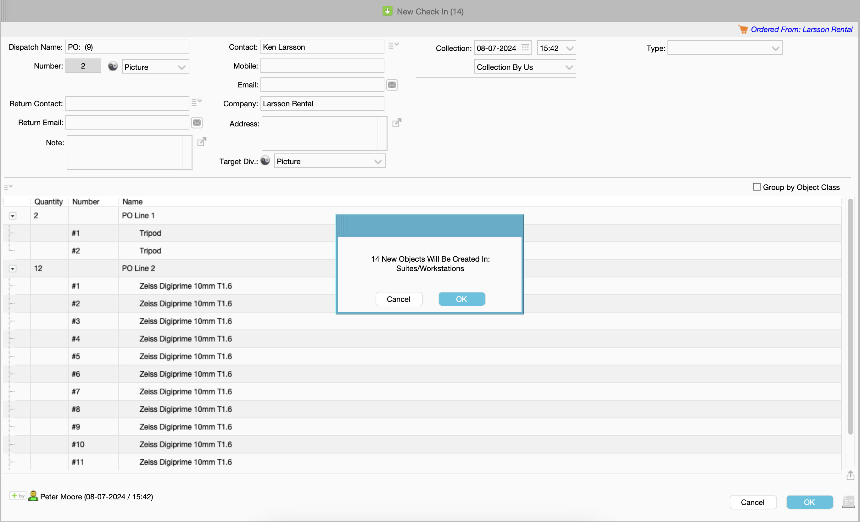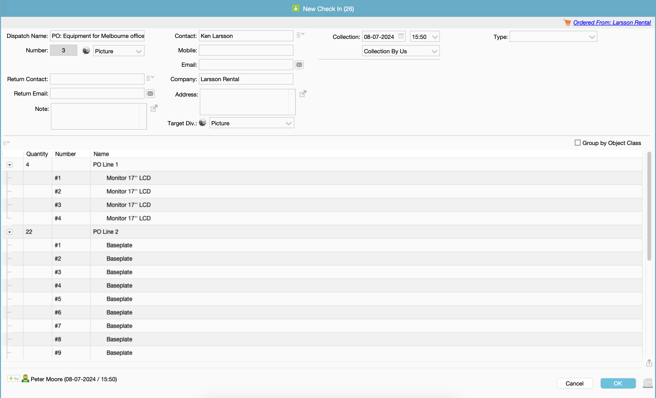 Once you click on OK in this PO Check In a message appears: " xx New Objects Will Be Created In "Equipment/Machines", which will create those items lines as Objects in the Object Manager. (The category where these Objects will be created can be set in the Server Setup > Financial tab > Outgoing Purchase Order).