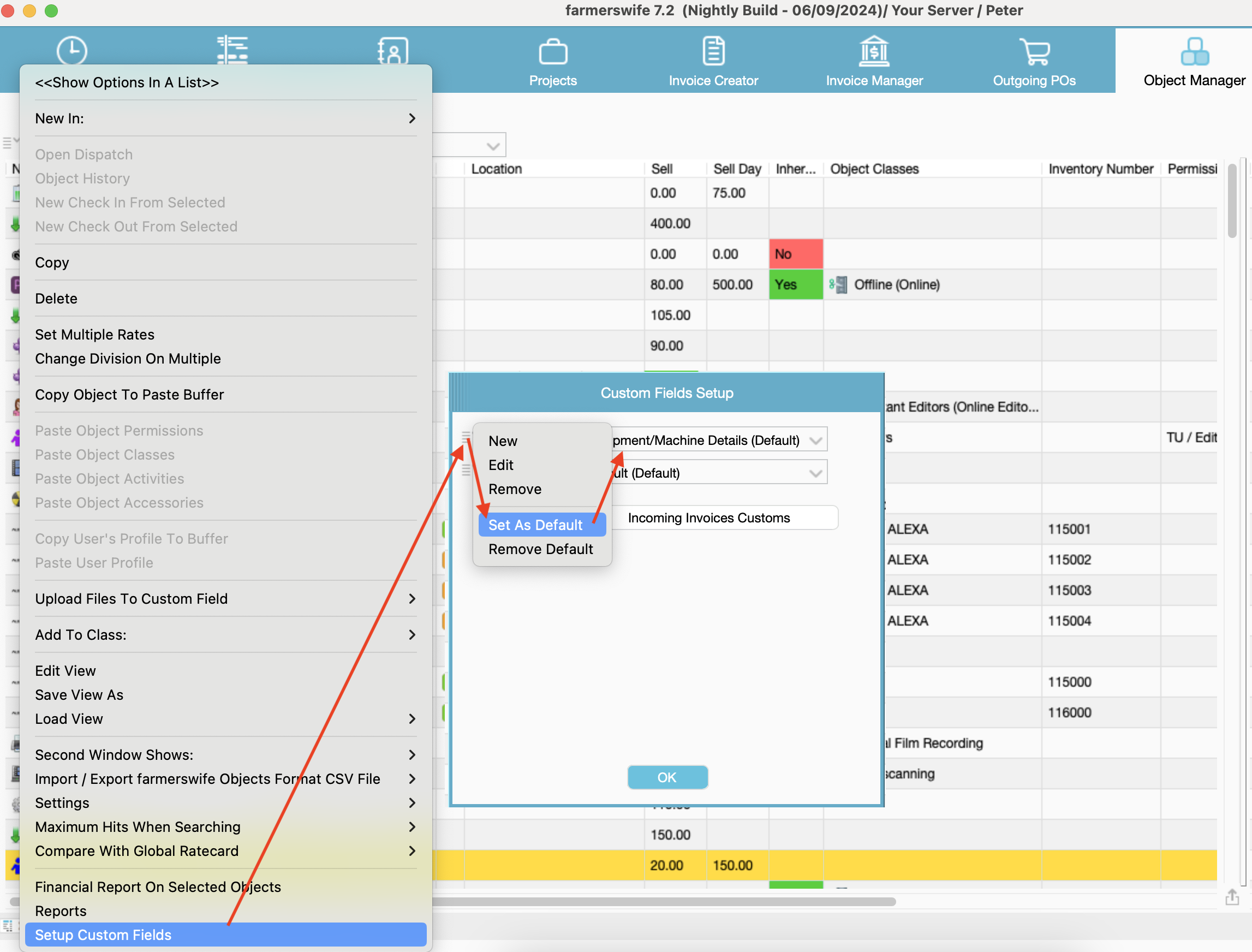 Go to the Object Manager > drop down menu > Setup Custom Fields > Objects> select the template that holds the Custom Field data for your equipment. Click on the drop down menu and select > Set As Default.