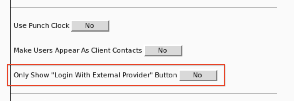 | Default | "Only Show "Login With External Provider" Button" = Yes |