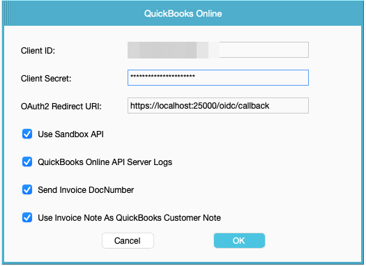 2. Click at Setup, this is a simple window where administrators enters: Client ID, Client Secret and OAuth2 redirect URI, toggle sandbox mode, enable API logging and control whether the invoice DocNumber is sent.