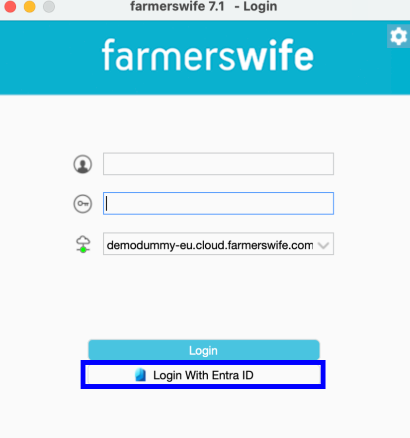 Once the integration between Entra ID and farmerswife is set up, on the farmerswife Desktop Client, Web and MWC login screen, the user will now see a "Login with Entra ID” button.