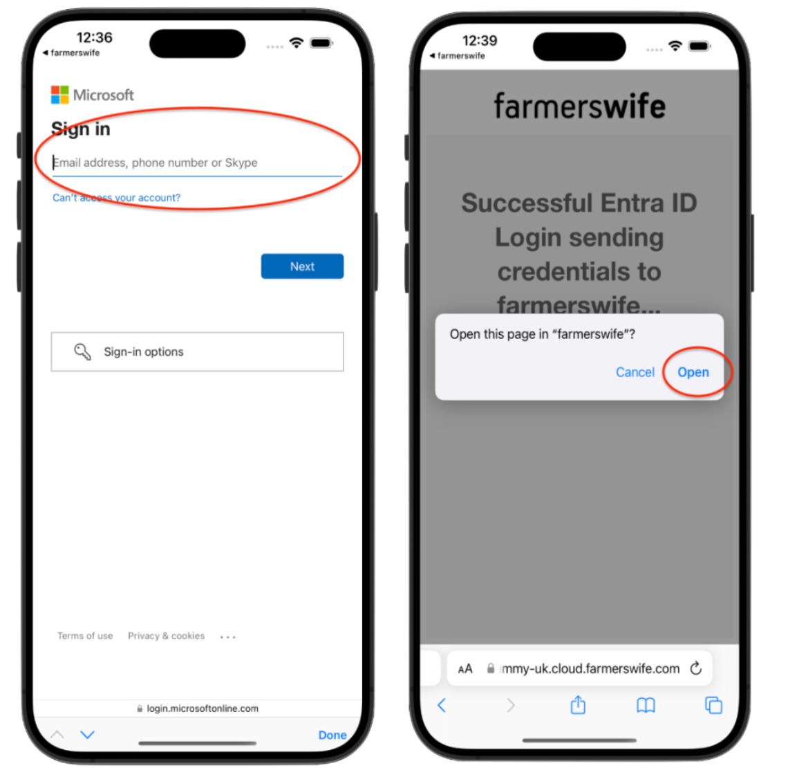 When EntraID SSO is enabled, Desktop, Web and iOS users will see an additional “Login with Entra ID” button on the farmerswife login screens.
